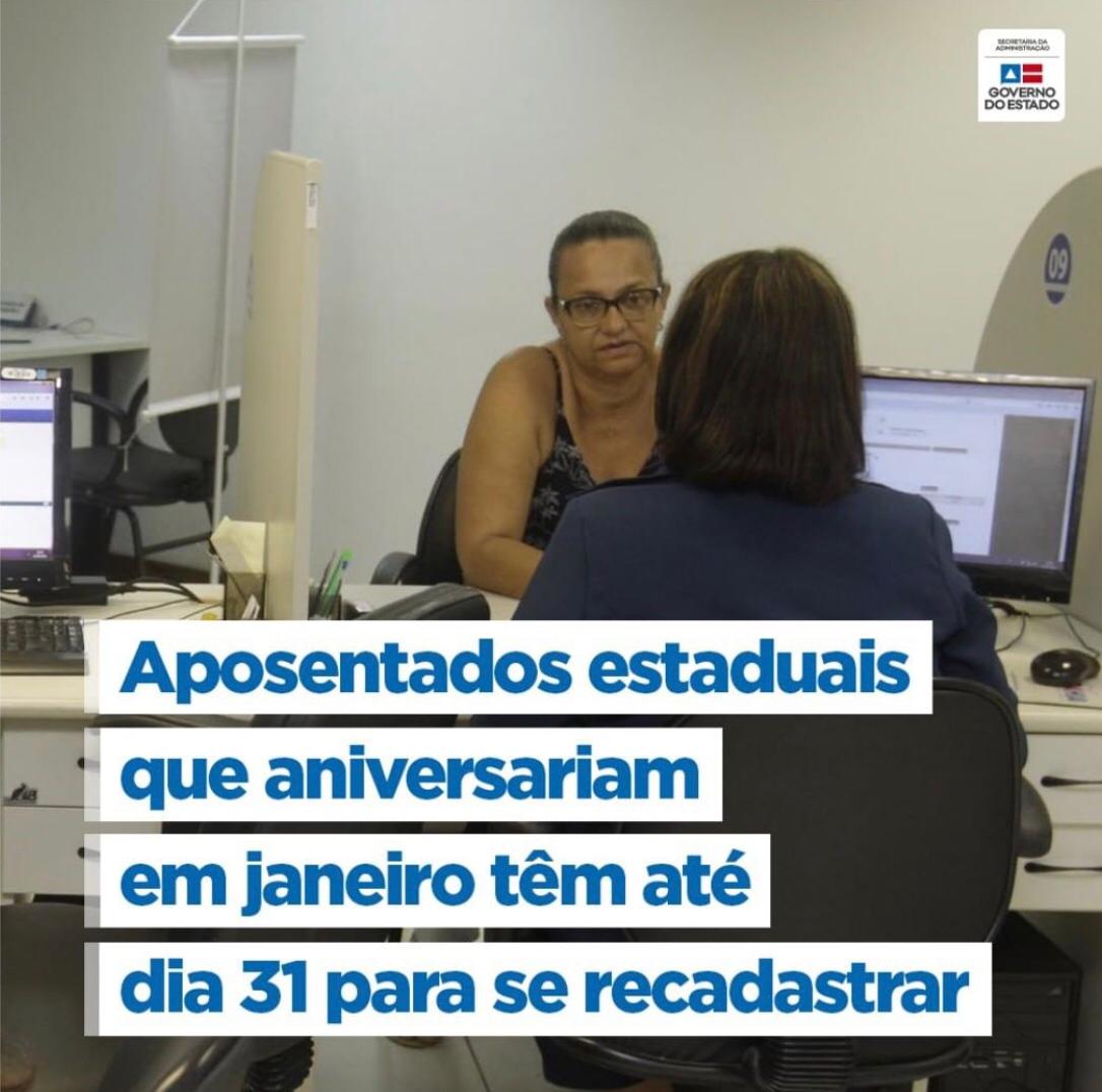 Iniciativa da Superintendência de Previdência (Suprev), vinculada à Secretaria de Administração do Estado da Bahia (Saeb), a convocação dos aposentados está sendo promovida este ano de acordo com uma nova sistemática. A orientação é de que o grupo se recadastre no mês do próprio aniversário e não mais de acordo com o calendário divulgado pela Suprev.  Desta forma, já a partir do próximo dia 3, começará o atendimento dos nascidos em fevereiro.