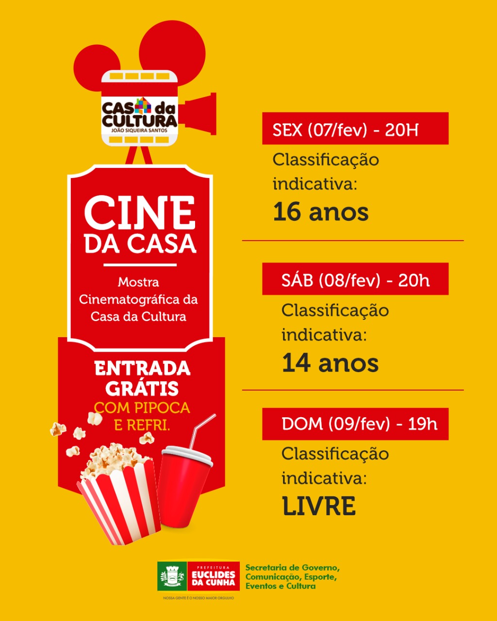 O Cinema define-se por “sétima arte”, reunindo um misto de emoções em cada pessoa que deslumbra-se com os olhos fixados na telinha. Sendo assim, a Casa da Cultura, traz essa paixão mundial para a comunidade euclidense, com entrada franca, pipoca e refrigerante.