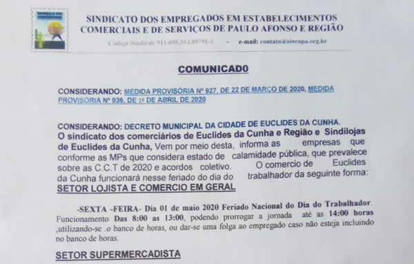 O sindicato dos comerciários de Euclides da Cunha e região, juntamente com o Sindilojas do respectivo município, informa as empresas que na próxima sexta-feira, dia 01 de maio, feriado nacional do Dia do Trabalhador, o funcionamento será das 8h00 às 13h00, podendo prorrogar a jornada até às 14h00.