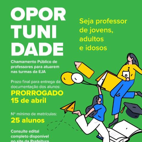 A Prefeitura Municipal de Euclides da Cunha, por meio da Secretaria Municipal de Educação (SEMEC), divulgou nesta quinta-feira (28) que o prazo final para entrega da documentação necessária para profissionais aptos a atuarem como professores alfabetizadores da EJA (Educação de Jovens e Adultos) para o ano letivo de 2024 foi prorrogado para o dia 15 de abril.