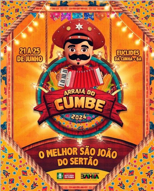 O cartaz do evento, recém-publicado no Instagram oficial da Prefeitura Municipal de Euclides da Cunha, não revela as atrações, apenas destaca a quantidade de dias – início e fim. Conforme as atrações musicais e os demais detalhes do Arraiá do Cumbe 2024 forem divulgados, a equipe do site euclidesdacunha.com dará ampla divulgação.
