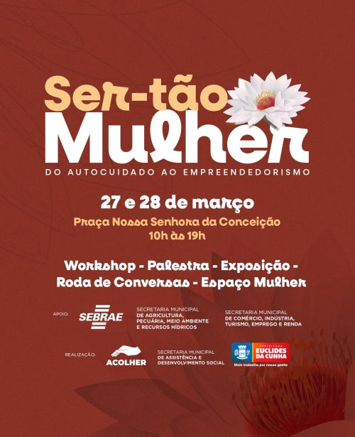 Nos dias 27 e 28 de março, Euclides da Cunha será palco de um evento especial voltado para o fortalecimento e valorização das mulheres: o Ser-tão Mulher. Em homenagem ao Dia Internacional da Mulher, a iniciativa busca proporcionar um espaço de diálogo, troca de experiências e crescimento, promovendo o desenvolvimento pessoal e profissional das participantes.